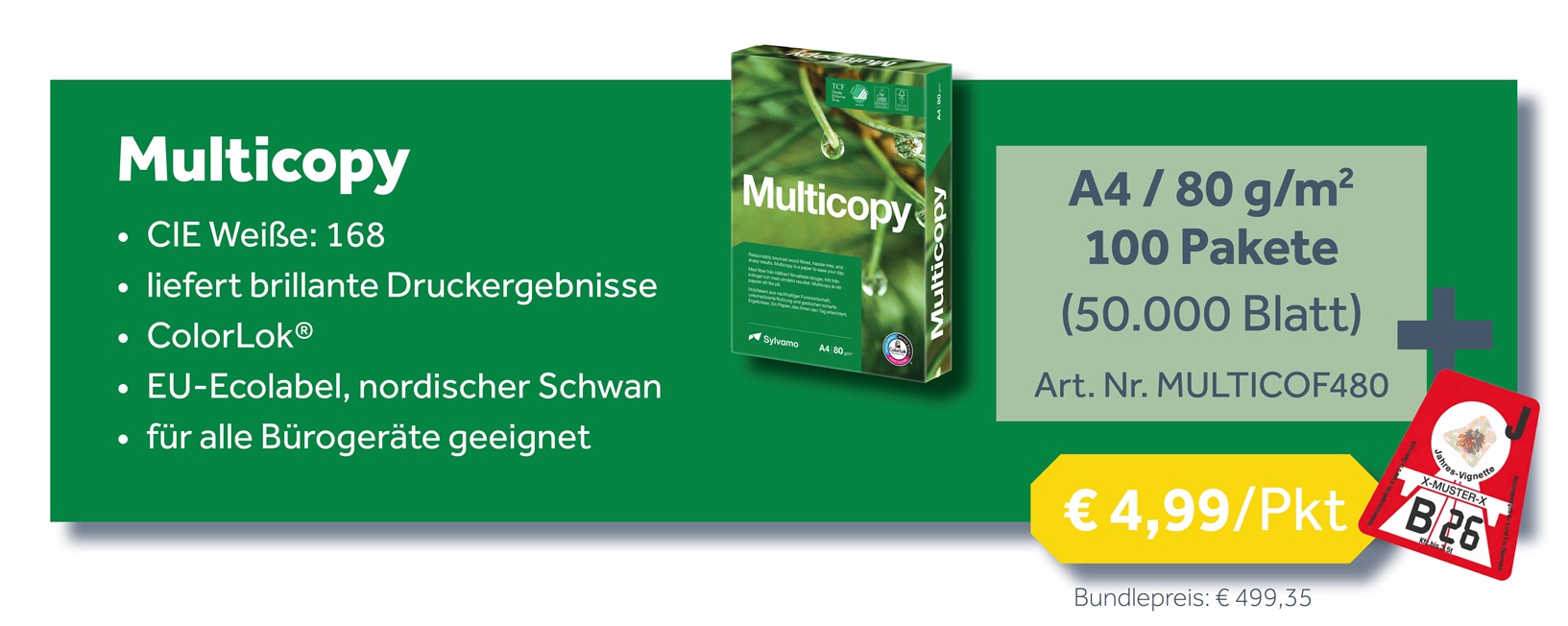 Multicopy ist ein hochwertiges, staubfreies Büro-Papier mit exzellenten Laufeigenschaften.