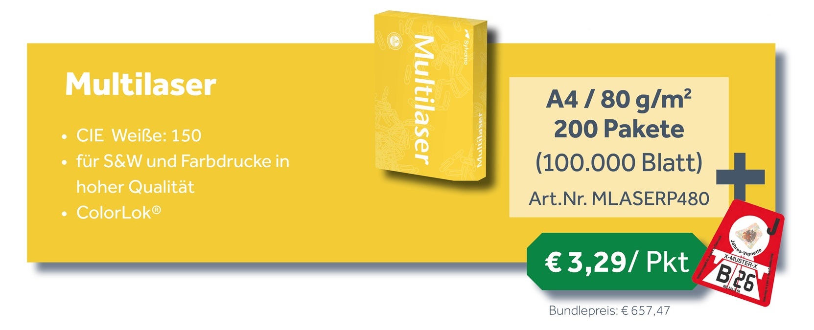 Bestellen Sie jetzt eine Palette Multilaser A4 / 80gm2 zum Aktionspreis von € 3,29 pro Paket und Sie erhalten eine Vignette dazu geschenkt.